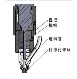 由管道输送的螺丝落入电批头底端,电批下压,弹簧压缩,批咀将螺丝压出电批头并锁付于产品上;当电批提起时,弹簧弹开,为进料管内螺丝让出通道并输出信号,迅速将下一粒螺丝送置电批头底端,如此重复。